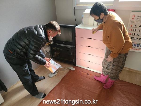 ▲ 사진=정귀수 녹번동장이 취약 어르신 가구에 방문해 온열매트를 설치하고 있다.은평구(구청장 김미경) 녹번동은 지난 19일 독거어르신과 한부모가족 등 동절기 취약계층의 한파 피해예방을 위해 난방용품 전기매트 22개를 배부했다.