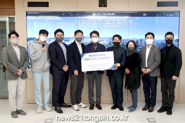 이날 협약식에는 성동구를 비롯 요기요 배달앱을 운영하는 주식회사 위대한상상(대표 서성원), 공공소통연구소(소장 이종혁), (사)성동구자원봉사센터(이사장 배문찬)가 참석해 캠페인 추진을 위한 상호협력을 약속했다. 곧이어 진행된 기부금 전달식에서는 성동구 지역기업 8곳에서 연간 1,200만원 규모로 ‘다양한 한끼’를 위한 첫 기부금을 기탁했다.