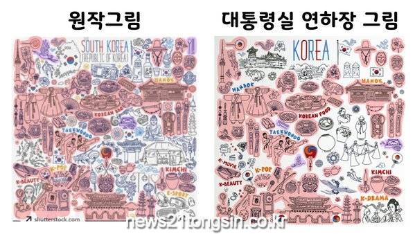 대통령실은 "일부 언론의 의혹 제기는 전혀 사실이 아니"라며 "연하장에 활용된 디자인 이미지는 외국인 시각에서 우리나라 문화컨텐츠를 형상화한 것으로 해당 업체에서 적법한 라이센스 계약을 통해 구현한 것으로 알고 있다"고 설명했다.