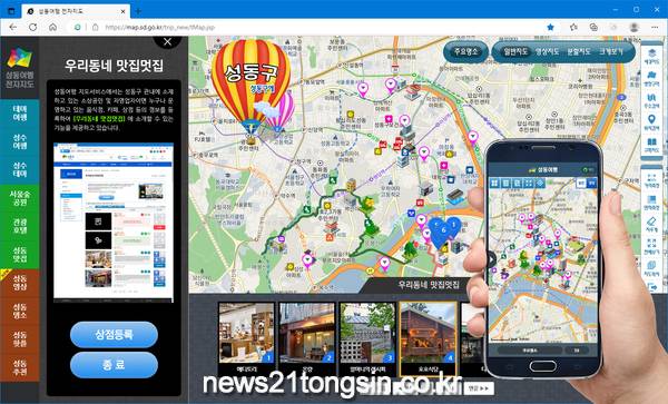 ▲  사진=성동구 홈페이지와 모바일로 볼 수 있는 ‘성동여행 지도플랫폼’서울 성동구(구청장 정원오)가 성동여행 지도플랫폼을 통해 관내 음식점, 카페 등 상점 정보를 등록하고 홍보할 수 있는 기능을 새롭게 제공한다.