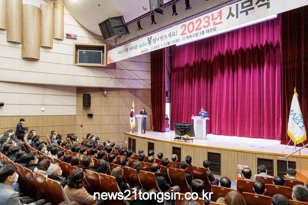 ▲ 사진=지난 1월 2일 마포구청 대강당에서 시무식을 열고 본격적인 새해 업무 시작을 알렸다.마포구(구청장 박강수)가 1월 2일, 2023년 구정의 출발을 알리는 시무식을 갖고 ‘변화’와 ‘활력’이 넘치는 ‘새로운 마포, 더 좋은 마포’를 향한 힘찬 발걸음을 내디뎠다.