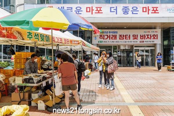 ▲ 사진=지난해 9월 마포구청 광장에서 개최된 추석맞이 직거래 장터 모습마포구(구청장 박강수)는 민족 고유의 명절 설을 맞아 1. 12.(목)부터 1.13(금)까지 이틀간 오전 10시에 오후 6시까지 구청 광장에서 ‘설맞이 농·특산물 직거래 장터 및 바자회’를 개최한다.
