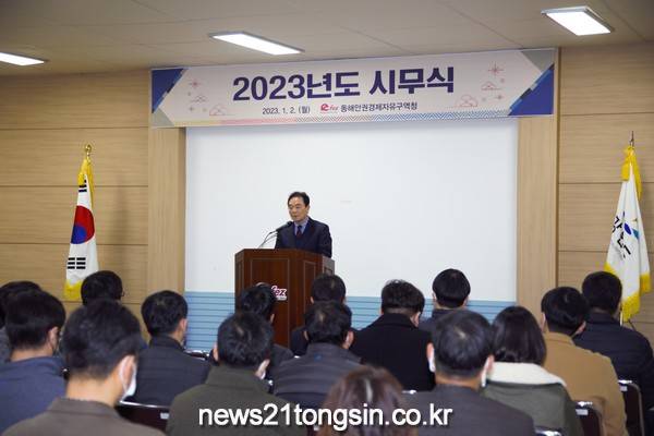 동해안권경제자유구역청(청장 심영섭)은 2일 청 대회의실에서 전 직원이 참석한 가운데 2023년 시무식을 개최하고 새해 새로운 각오를 다졌다.
