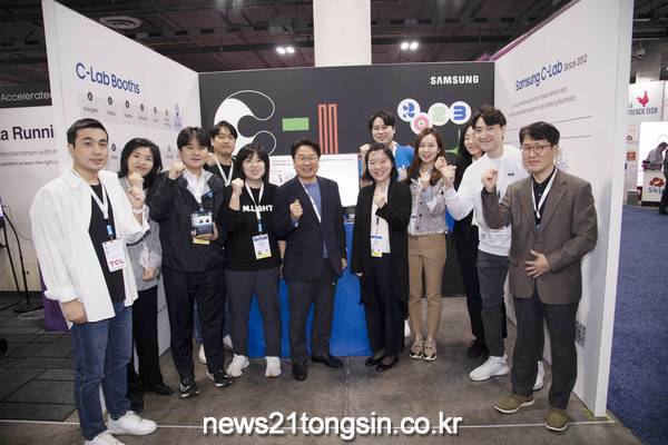 ▲  사진=강기정 광주광역시장이 7일(현지시간) 미국 라스베가스에서 열린 `CES 2023` 유레카 파크 삼성전자 C랩(C-Lab) 전시관을 찾아 청년스타트업 대표들을 격려한 뒤 기념촬영을 하고 있다./광주광역시 제공강기정 광주광역시장과 광주방문단이 7일(현지시간) 미국 라스베이거스 ‘CES 2023’에서 삼성 C-Lab 전시관을 찾아 청년 스타트업 창업가들을 만났다.