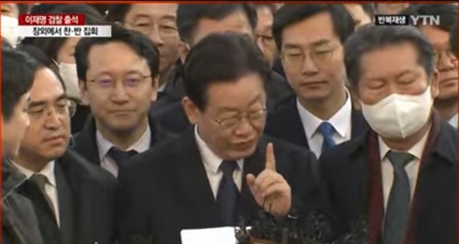 10일 이재명 대표는 검찰 출석 전 포토라인에서  “오늘 이 자리는 역사에 기록될 것”이라며 “불의한 정권의 역주행을 이겨내고 역사는 전진한다는 명백한 진리를 증명한 역사의 변곡점으로 기록되기를 바란다”며 입장을 밝혔다.