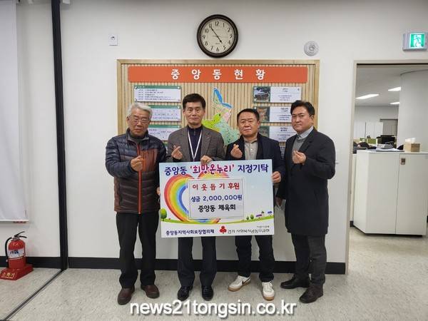 정 동장은 “중앙동의 생활체육 발전에 노력하는 중에도 매년 끝없는 이웃돕기를 이어오고 있음에 감사드린다.”며, “어려운 이웃들을 위해 값지게 사용하겠다.”고 말했다.