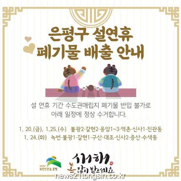 ▲ 사진=은평구, 설 연휴 폐기물 배출 안내서울 은평구(구청장 김미경)는 설 연휴 주민들이 쾌적한 환경에서 명절을 보낼 수 있도록 ‘청소대책 상황실·기동반’을 운영한다고 밝혔다.