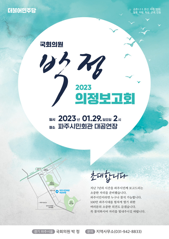 더불어민주당 박정 의원 ( 경기 파주시을 ) 은 오는 29 일 오후 2 시 , 파주시민회관 대공연장에서 ‘2023 의정보고회 ’ 를 개최한다고 밝혔다.
