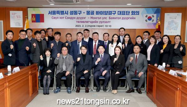 ▲  사진=지난 2일 성동구청에서 성동구와 몽골 바이양걸구 대표단 회의를 개최하고 단체사진을 찍고 있다.서울 성동구(구청장 정원오)는 지난 1일 국외 자매도시인 몽골 바이양걸구 대표단이 5박 6일 일정으로 성동구를 공식 방문했다고 밝혔다.