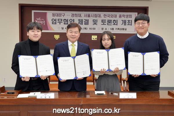 ▲  사진=이필형 동대문구청장(사진 왼쪽 두 번째)이 한국외대, 서울시립대, 경희대 총학생회 임원들과 기념사진을 촬영하고 있다.동대문구(구청장 이필형)가 ‘청년이 모이는 동대문구’ 구현을 위해 9일 오후 경희대학교, 서울시립대학교, 한국외국어대학교 3개 대학의 총학생회와 업무협약을 체결했다.