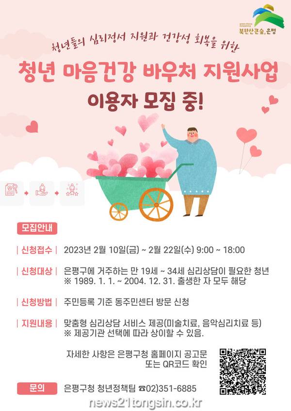 ▲ 사진=은평구, 청년마음건강 바우처 지원 사업 홍보 포스터서울 은평구(구청장 김미경)가 심리적 어려움을 겪는 청년에게 심리상담 서비스를 제공하는 ‘청년마음건강 바우처 지원사업’ 이용자를 22일까지 모집한다.