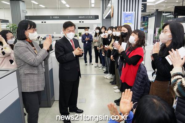 ▲  사진=이필형 동대문구청장(사진 왼쪽 두 번째)이 민원 담당 직원들을 격려하고 있다.
