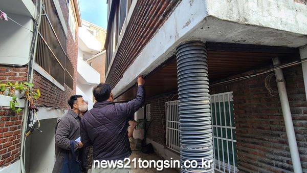 ▲ 사진=구 관계자들이 건축물 주요구조부를 안전 점검하고 있다.서울 은평구(구청장 김미경)는 안전 사각지대에 놓인 소규모 노후 건축물을 대상으로 안전 점검을 시행한다고 밝혔다.