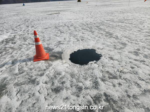 ▲ 사진=부분 해빙 발생/강원도 제공강원도는 입춘 이후 기온 상승에 따른 얼음낚시터 등 수난사고 발생이 우려되는 얼음낚시터를 2. 10.(금) 춘천시와 합동점검을 실시하였다.
