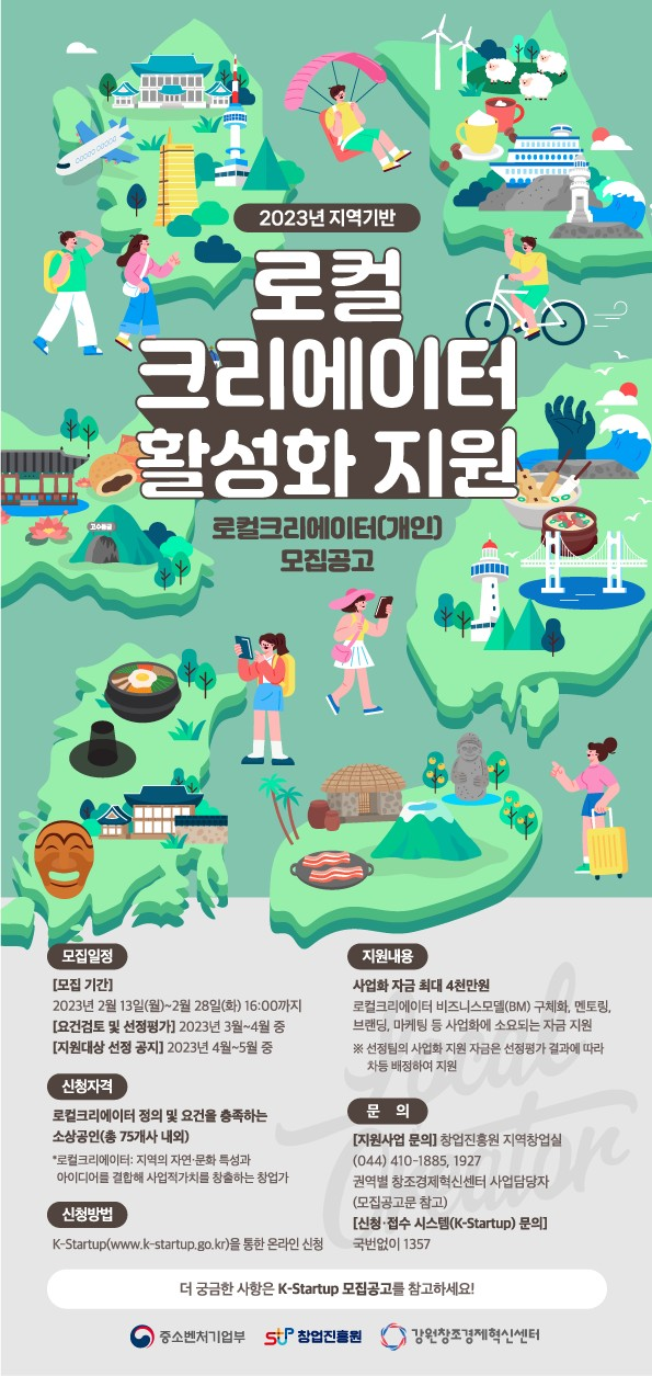▲ 강원창조경제혁신센터, 2023 지역기반 로컬크리에이터 활성화 지원사업 참가자 모집강원창조경제혁신센터(센터장: 이기대, 이하 ‘강원혁신센터’)는 이달 13일부터 28일까지 ‘지역기반 로컬크리에이터 활성화 지원’ 사업 참가자를 모집한다.