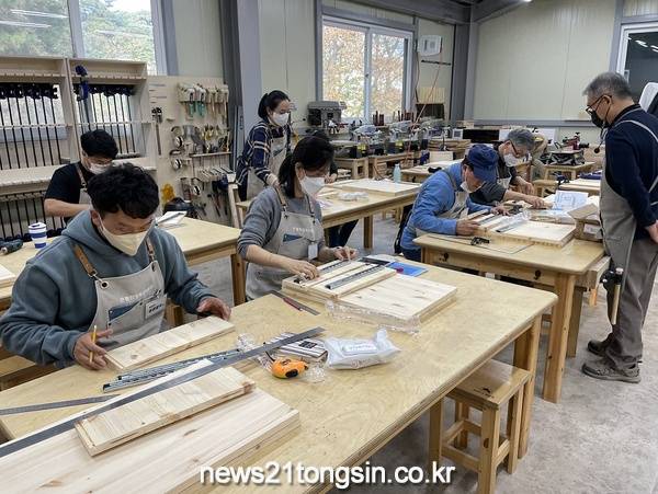 ▲ 사진=은평희망목공체험장에서 수강생들이 목공과정을 배우고 있다.서울 은평구(구청장 김미경)는 내달 6일부터 목재 이용문화 활성화를 위한 ‘목공체험 프로그램’을 운영한다고 밝혔다.