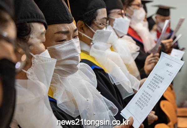 ▲  사진=16일, 상일학교 졸업식에서 졸업생들이 눈물의 교가를 부르고 있다.   광진구(구청장 김경호)에서 16일, 성인문해교육기관인 ‘상일학교’의 졸업식이 열렸다.