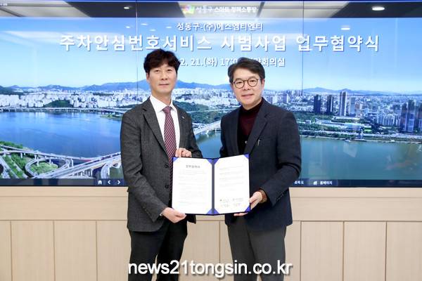 ▲  사진=지난 21일 주차 안심번호 서비스 시범사업 업무협약을 맺고 정원오 성동구청장(사진 왼쪽)이 업체 대표와 사진을 찍고 있다.서울 성동구(구청장 정원오)가 지난 21일 차량에 비치된 전화번호가 범죄에 악용되지 않도록 ㈜에스엠티엔티(대표자 김문식)와 ‘주차안심번호서비스 시범사업’ 업무협약을 체결했다.
