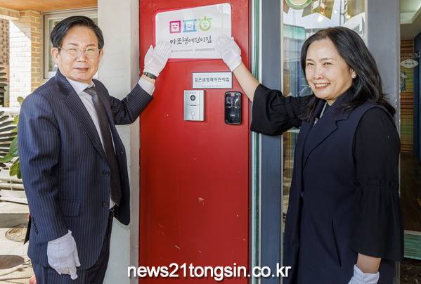 ▲ 사진=24일 오후, 마포형어린이집으로 선정된 ‘깊은샘 영재어린이집’에 방문한 박강수 마포구청장(좌)이 정영란 원장(우)과 함께 현판식에 참석했다.마포구(구청장 박강수)가 마포형어린이집 4곳을 선정하고, 3월부터 1년간 시범운영에 들어간다. 시범운영 후에는 대상을 10곳으로 확대할 계획이다.