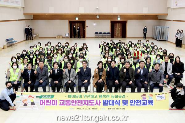 ▲  사진=지난 27일 성동구청 3층 대강당에서 어린이 교통안전지도사 발대식 및 안전교육을 실시하고 단체사진을 찍는 모습서울 성동구(구청장 정원오)가 오는 3월 2일 새학기에 맞추어 안전한 등하교 지원 및 올바른 보행습관 형성을 위한 워킹스쿨버스 사업을 시작한다.