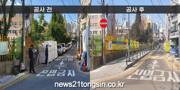▲  사진=신갈초 후문 어린이 안심 골목 조성 전, 후 모습용인특례시(시장 이상일)는 기흥구 신갈초등학교 후문 350m 구간을 ‘어린이 안심골목’ 으로 조성했다고 14일 밝혔다.