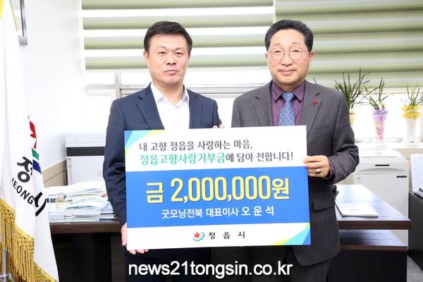 ▲ 정읍시= 고향사랑기부금 200만원 전달뉴스21통신전북/김문기기자=오운석 굿모닝전북 대표이사는 지난 20일 정읍시청을 방문해 고향사랑기부제 기부금 200만원을 전달했다.