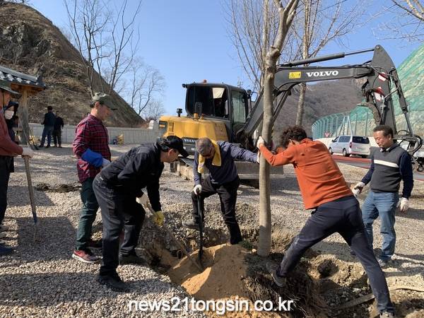 또한, 4월5일 식목일을 앞두고 대아리 도로변 휴식공간에 철쭉 450본과 단풍나무2주와 산천마을 박종식씨가 기증한 느티나무 3주를 식재했다.