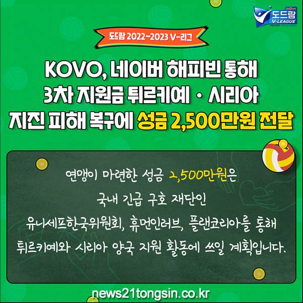 ▲ 사진=한국배구연맹한국배구연맹(총재 조원태)이 연맹 NFT(대체불가토큰) 사업권자인 블루베리메타와 함께 네이버 해피빈 튀르키예·시리아 지진 피해 복구 지원 캠페인에 성금 2,500만원을 전달했다.