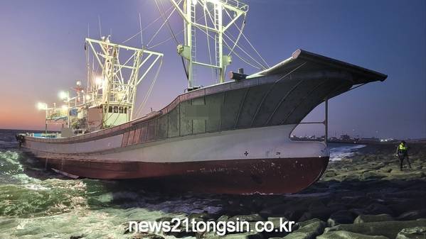 ▲ 군산해경= 새만금 방조제 좌주선박 안전관리뉴스21통신전북/김문기기자=군산 비응항으로 입항하던 어선이 새만금 방조제에 얹히는 사고가 발생해 해경이 긴급 출동했다.