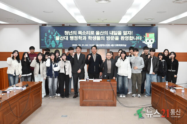 [뉴스21 통신=최세영 ]        ▲ 사진제공=울산광역시의회울산광역시의회(의장 이성룡)는 31일, 울산대 행정학과 대학생들이의회를 방문해 본회의장을 둘러보고, 이성룡 의장, 권순용 위원장(꿈의도시 울산 청년과 함께 특별위원회)과 함께 의회 차원에서 청년들이 체감할 수 있는 정책지원에 대한 소통의 시간을 가졌다고 밝혔...