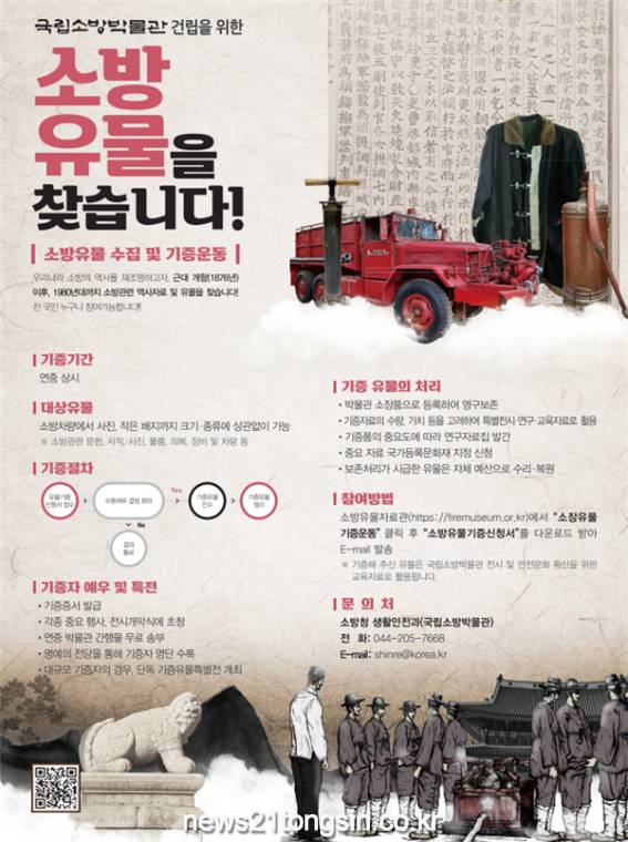 ▲ 정읍소방서=‘소방역사를 품은 유물’을 찾습니다뉴스21통신전북/김문기기자=정읍소방서(서장 박경수)는 2024년 건립예정인 국립 소방박물관에서 전시할 유물을 수집하고 있다고 밝혔다.