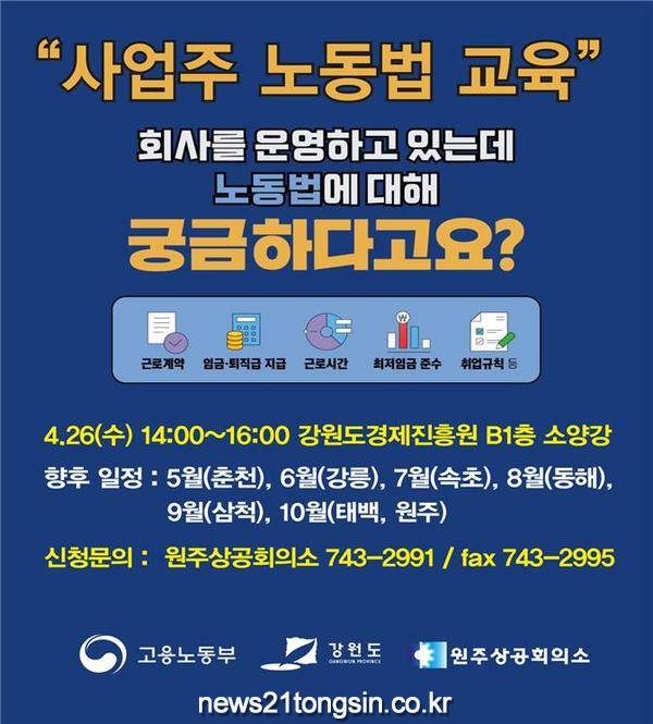 ▲ 강원도 ‘2023년 사업주 노동법 교육’ 실시 강원도는 2023년 사업주 노동법교육을 4.26(수) 강원도경제진흥원에서 실시 한다고 밝혔다. 4월 원주를 시작으로 10월까지 진행되는 이번 교육은 도내 7개 지역에서 총 8회 진행될 예정이다.