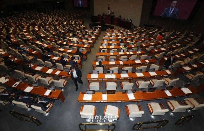 ‘의회폭주 규탄’ ‘돈봉투 방탄’이라 적힌 손팻말을 자리에 부착한 국민의힘 의원들은 각 안건 투표 전 집단 퇴장했다가 투표가 끝나면 다시 회의장에 들어오는 방식으로 항의했다. 김기현 대표는 국회 본관 로텐더홀에서 연 규탄대회에서 “민생은 내팽개치고 민주당의 위기 모면만을 위한 입법 폭주는 반드시 심판을 받게 될 것”이라고 말했다.