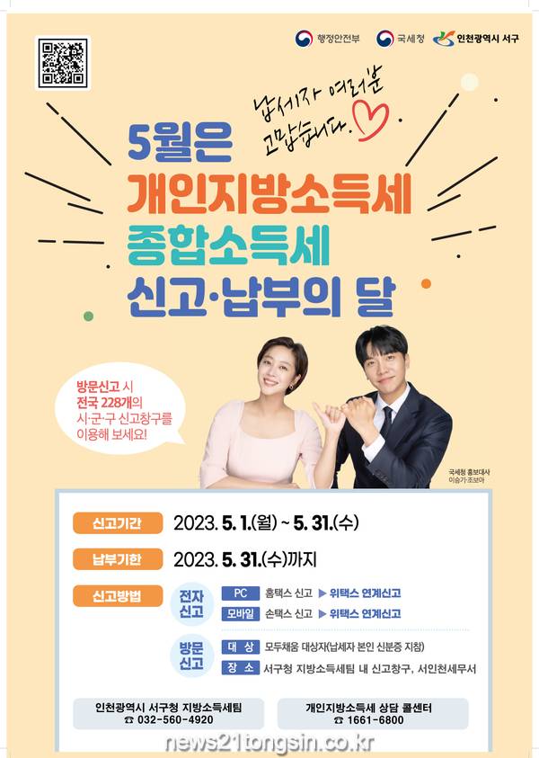 ▲ 서구, 5월 개인지방소득세·종합소득세 ‘합동신고창구’ 운영인천 서구(구청장 강범석)가 지난해 귀속 종합소득세·개인지방소득세 확정신고의 달을 맞아 31일까지 ‘합동 신고 도움 창구’를 운영한다고 1일 밝혔다.