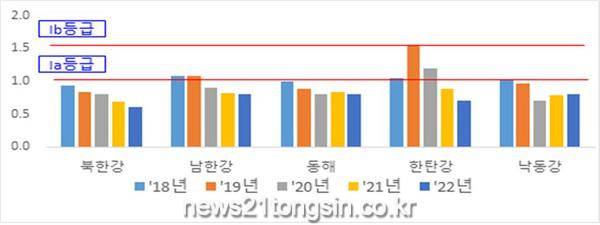 하천 생물화학적산소요구량(BOD) 기준으로 매우좋음(Ia) 등급비율은 꾸준히 증가 추세를 보이며 2018년부터 2022년까지 약 10%가 증가된 것으로 분석되었다.