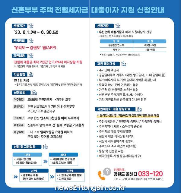 ‘신혼부부 주거자금 대출이자 지원’ 사업은 도내 신혼부부 가구가 전·월세 주거자금을 대출받았을 경우 연간 최대 3% 범위 내 이자 상환액을 지원해 주는 사업이다.