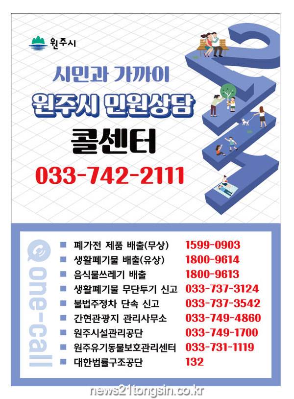 한편, 원주시 콜센터(033-742-2111)는 평일 오전 8시 30분부터 오후 6시 30분까지 운영되며 상담원 9명이 각종 민원 및 시정에 대한 기초적인 상담을 제공하고 있다.