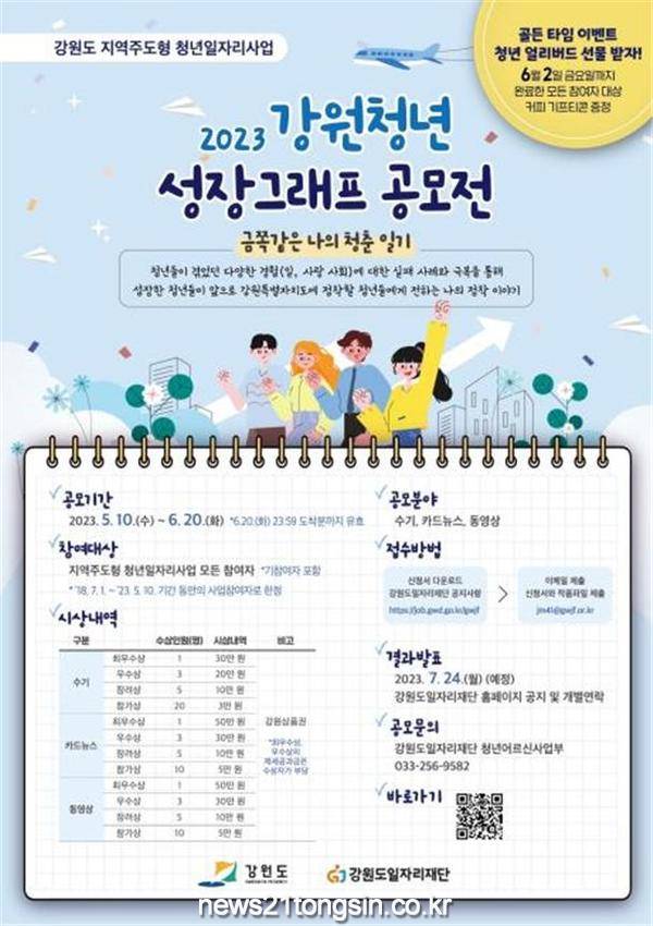 강원도와 (재)강원도일자리재단(이하 재단)이 강원도 지역주도형 청년일자리사업(기참여자 포함) 참여자를 대상으로 다음달 6월 20일까지 「2023 강원청년 성장그래프 공모전」을 공모한다.