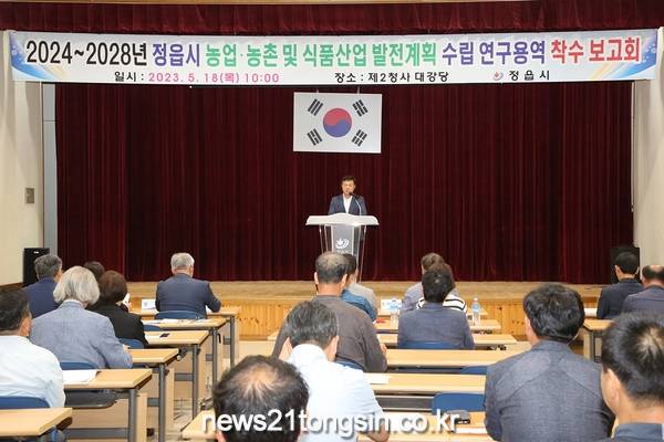 ▲ 정읍시= 농업·농촌 식품산업 발전계획 수립 용역 착수보고회 개최정읍시는 18일 제2청사에서 민선 8기 시정방향을 포괄하는 농정 목표와 기본방향을 설정하기 위한 2024~2028 정읍시 농업·농촌 및 식품산업 발전계획 수립 연구용역 착수보고회’를 개최했다.