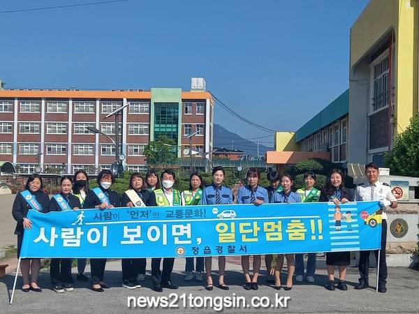 뉴스21통신전북/김문기기자=정읍경찰서(서장 황동석)는 지난 22일 어린이날은 맞아 정읍시 북초등학교에서 정읍서, 정읍시 의회, 녹색어머니회, 교직원, 학생, 학부모 등 총 40여명과 함께 어린이 교통안전을 위한 등굣길 캠페인을 펼쳤다고 밝혔다.