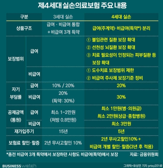 의료비중 보험가입자가 내는 몫(자기부담금 비율)은 급여 20%, 비급여 30%로 기존보다 높아졌고 재가입 주기도 5년으로 짧아졌다.