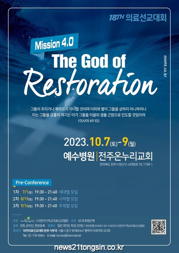 사) 한국기독교의료선교협회가 주최하며 전주예수병원과 전주온누리교회가 공동 주관하는 제18차 의료선교대회는 “The God of Restoration” 주제로 10월7일부터 9일까지 3일간 개최될 예정이다.
