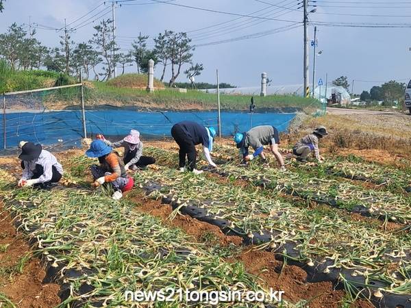 하여 부족한 일손을 보태고, 한참 수확시기인 양파를 주민들과 함께