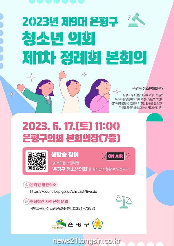 이번 제9대 은평구 청소년의회 위촉식 및 본회의는 지역주민의 현장 참관이 가능하며, 은평구의회 홈페이지를 통해 생중계할 예정이다.