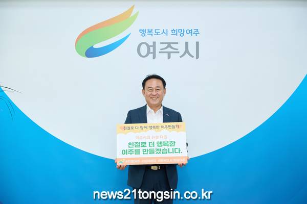 ▲ 여주시, 친절로 다 함께 행복한 여주를 만들기 위한 친절 다짐 릴레이 시작여주시(시장 이충우)는 여주시의 이미지 및 경쟁력 개선을 위해 7월부터 ‘친절로 다 함께 행복한 여주만들기’를 시작한다.