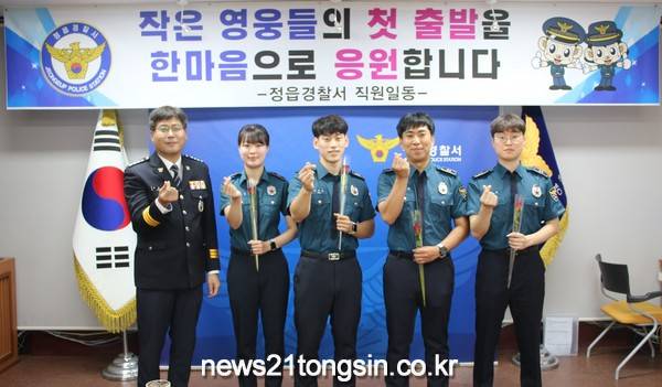 뉴스21통신전북/김문기기자=정읍경찰서(서장 황동석)는 지난 26일 경찰서 2층 어울마당에서 제312기 신임경찰관 순경 김반석, 순경 김석환, 순경 정다몬, 순경 최예슬(여) 총 4명을 따뜻한 마음으로 맞이하는 환영식을 가졌다.