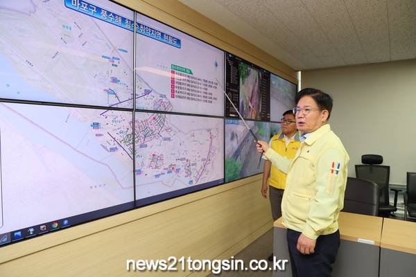 ▲ 사진=29일 오전 마포구재난안전대책본부가 소집돼 박강수 구청장이 CCTV를 통해 관내 침수취약 지역을 모니터링 하고 있다.마포구(구청장 박강수)가 29일 많은 비가 예상됨에 따라 오전 8시부로 재난안전대책본부를 긴급 소집했다.