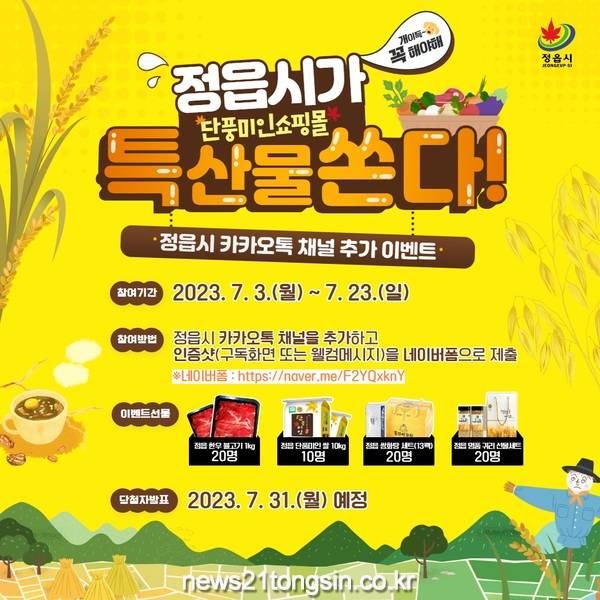 참여방법은 카카오톡에서 정읍시청 채널을 추가하고 채널 추가화면이나 웰컴메시지를 캡쳐해 네이버 폼을 통해 제출하면 된다.