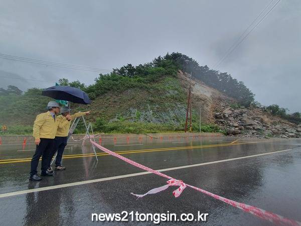 이번에 발생한 산사태는 지속적인 장맛비로 인하여 지반이 약화되어 발생한 것으로 추정되며, 현재 내장저수지 일원 도로는 통제 중에 있다.