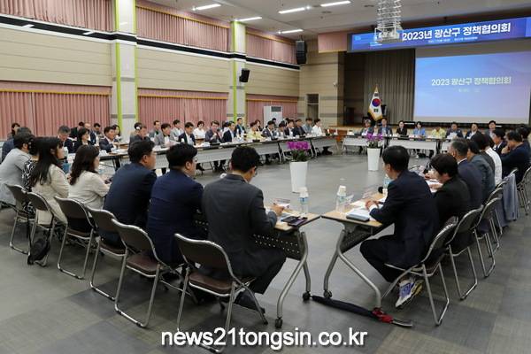 ▲ _광산구-더불어민주당 지역위 정책협의회[뉴스21통신/박연갑 기자] 광주 광산구는 17일 구청 7층 윤상원홀에서 더불어민주당 광산구 갑‧을 지역위원회와 2023년 정책협의회를 개최하고 주요 정책 현안의 성공적인 추진을 위한 협력을 다짐했다고 밝혔다.
